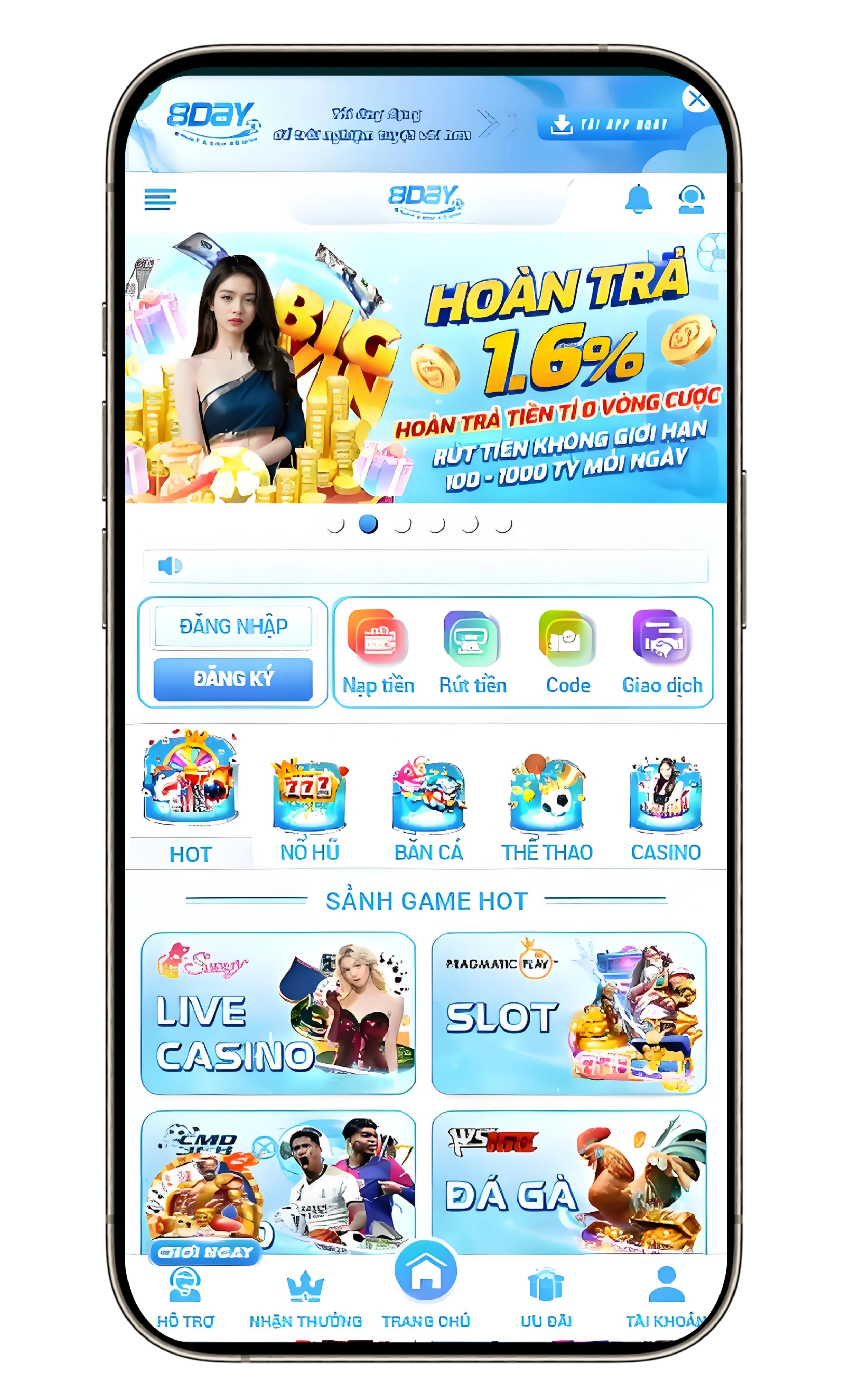 Khi đến với 8Day game thủ sẽ bất ngờ với số lượng sản phẩm cược tại hệ thống lên đến hàng trăm trò chơi đình đám. Với hàng loạt các sảnh cược đang phổ biến hiện nay như bắn cá, game nổ hũ, game đánh bài, xổ số, esports…Mỗi sảnh game đều được thiết lập với mức trả thưởng khác nhau điều này giúp cho bạn hoàn toàn yên tâm với giá trị tiền thưởng tại đây vì rất cao.